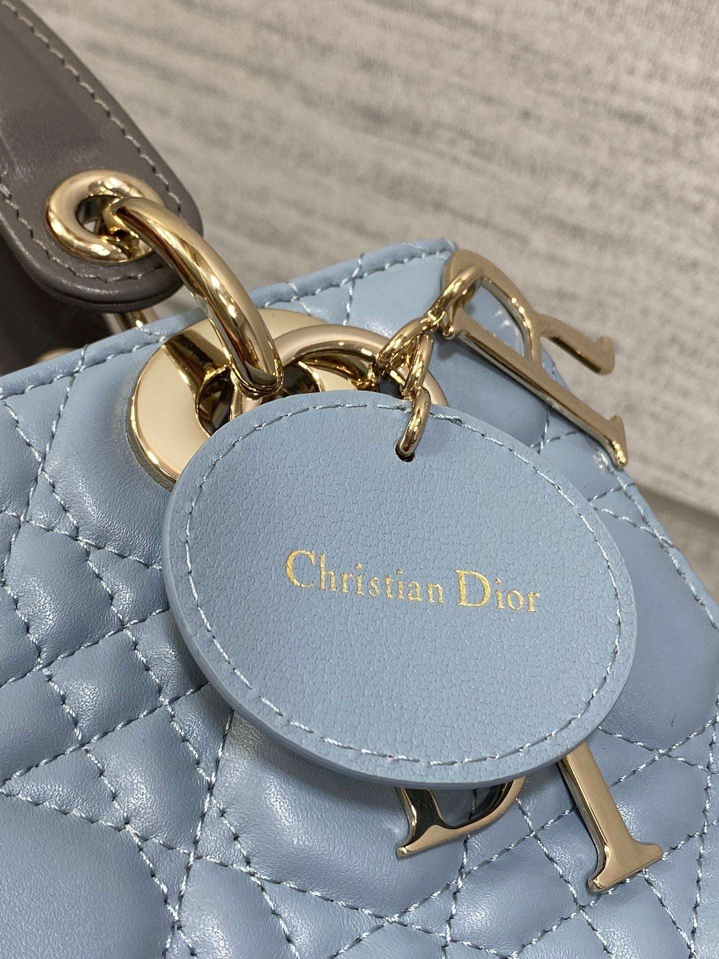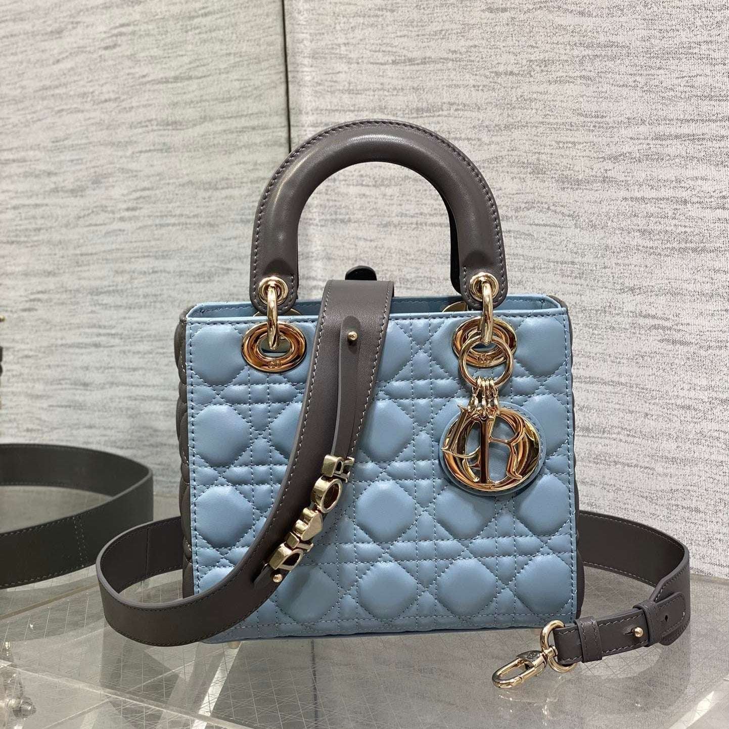 MEDIUM LADY BAG 20 IN BABY BLUE QUILTED MACROCANNAGE CALFSKIN GREY STRAP - LuxuryRepBags